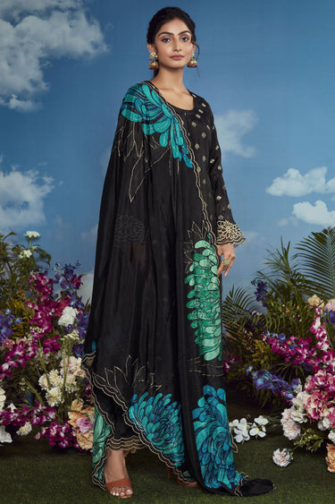 Turn heads at your next function in our semi-stitched embroidered organza fabric palazzo salwar kameez. The muslin weaving buttis top with an organza cutwork border design makes a unique fashion statement. The matching pure chinnon digital print dupatta is a work of art with hand brush details on the abstract floral print, all surrounded by an organza scalloped border. Made from pure cotton satin, the bottom offers unrivaled comfort and a classy finish. The top, with a length of 45 inches, can be tailored to fit up to 54.