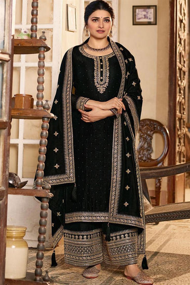 Function Wear Georgette Fabric Black Color Embroidered Work Soothing Palazzo Suit Featuring Prachi Desai