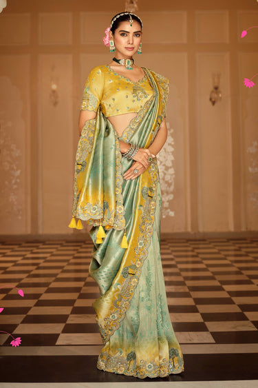 Function Wear Viscose Jacquard Embroidered Border Work Saree In Sea Green Color