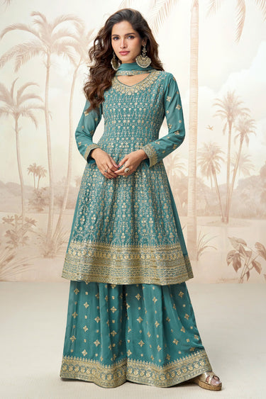 Georgette Cyan Heavy Embroidery Work Readymade Palazzo