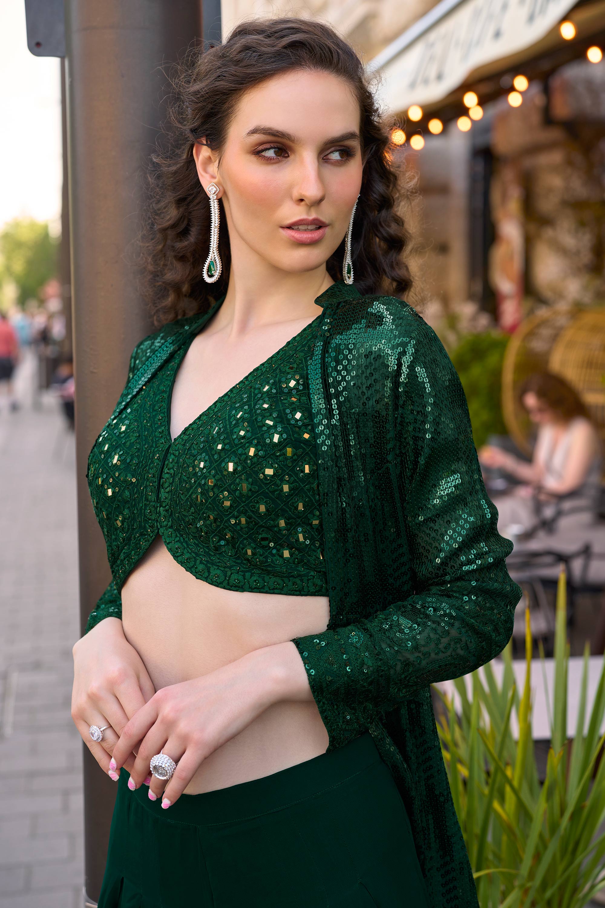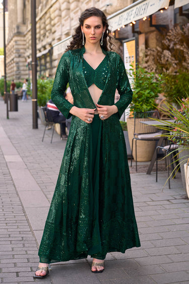 Georgette Embellished Indo Western Crop Top With Palazzo And Shrug