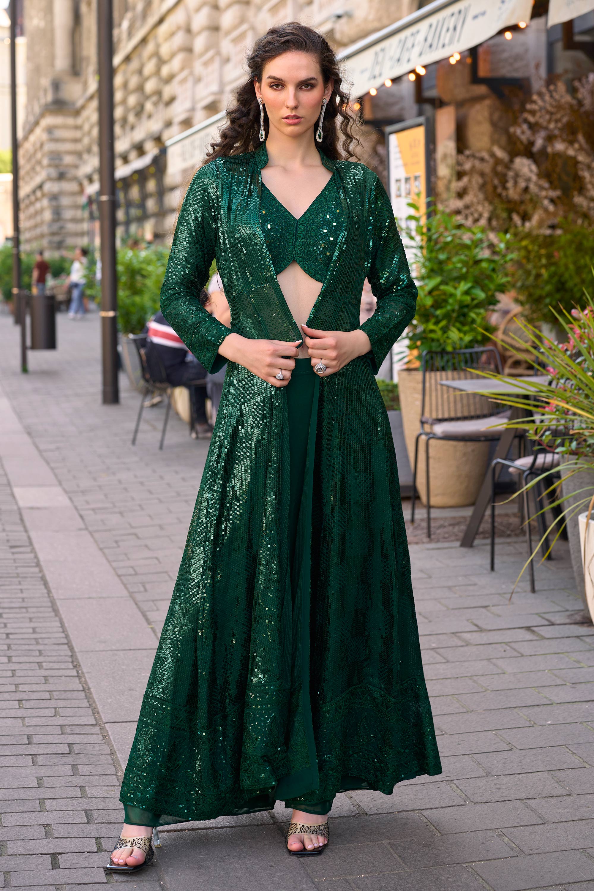 Stay stylish and comfortable with this beautifully designed Sequins Embroidered Western Look Outfit. Featuring a modern blouse, palazzo pants, and a flowy long shrug, this set exudes elegance and sophistication. The sequin embroidery adds a glamorous finish to this fashion-forward outfit, perfect for parties, festive occasions, or a chic outing with friends. Made with breathable fabrics and a tailored fit, its ideal for those who value comfort without compromising style. Update your wardrobe today with this standout ensemble.