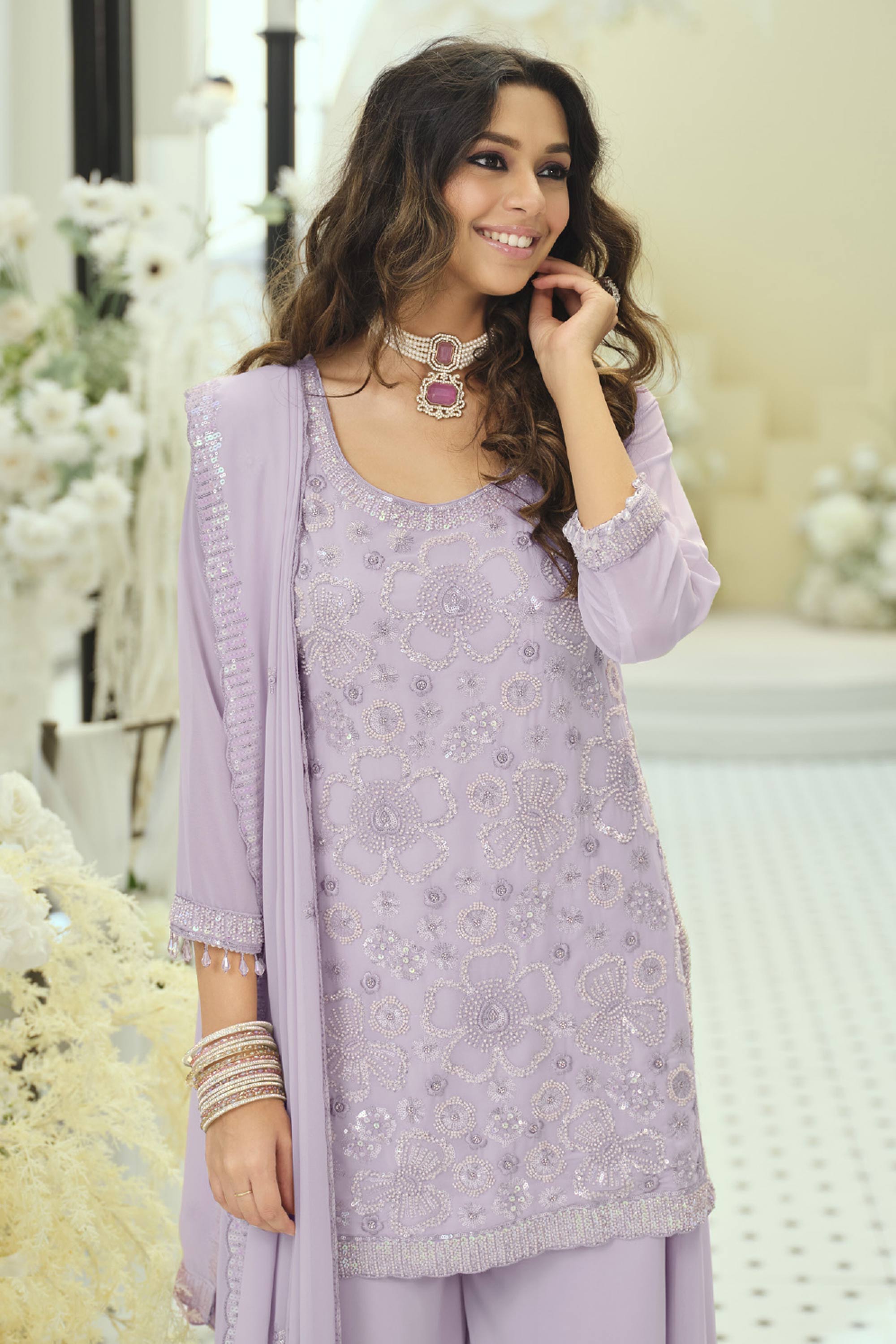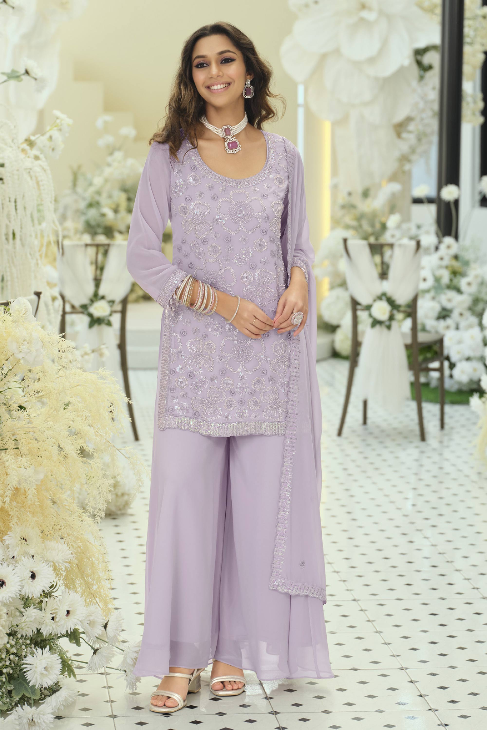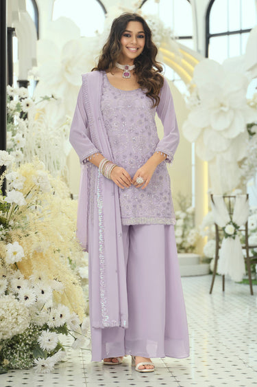 Georgette Embroidered Lavender Festive Wear Readymade Palazzo Suit