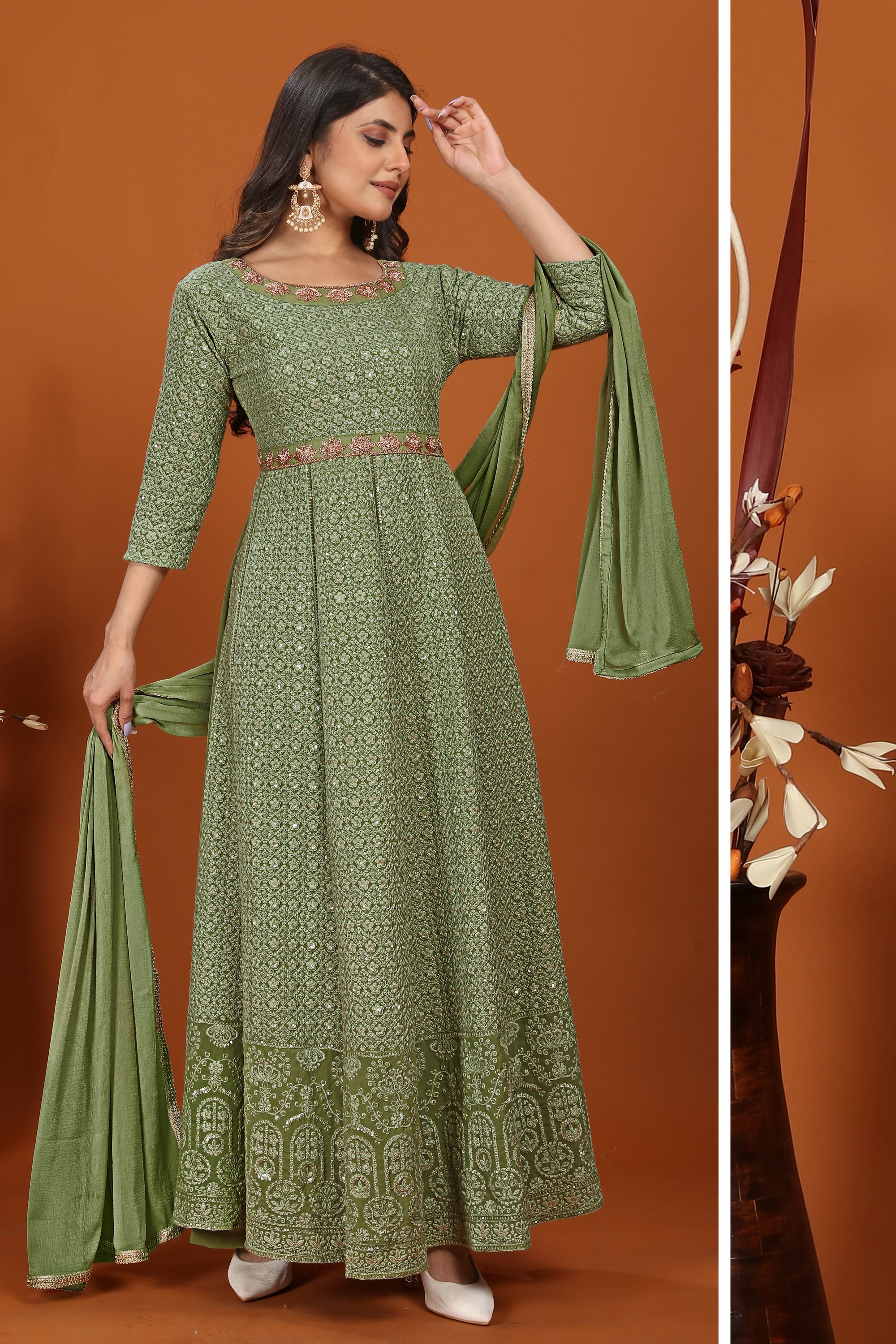 Elevate your style with our readymade Georgette gown, adorned with exquisite embroidery and paired with a matching dupatta. Perfect for function wear, this gown combines elegance and comfort.