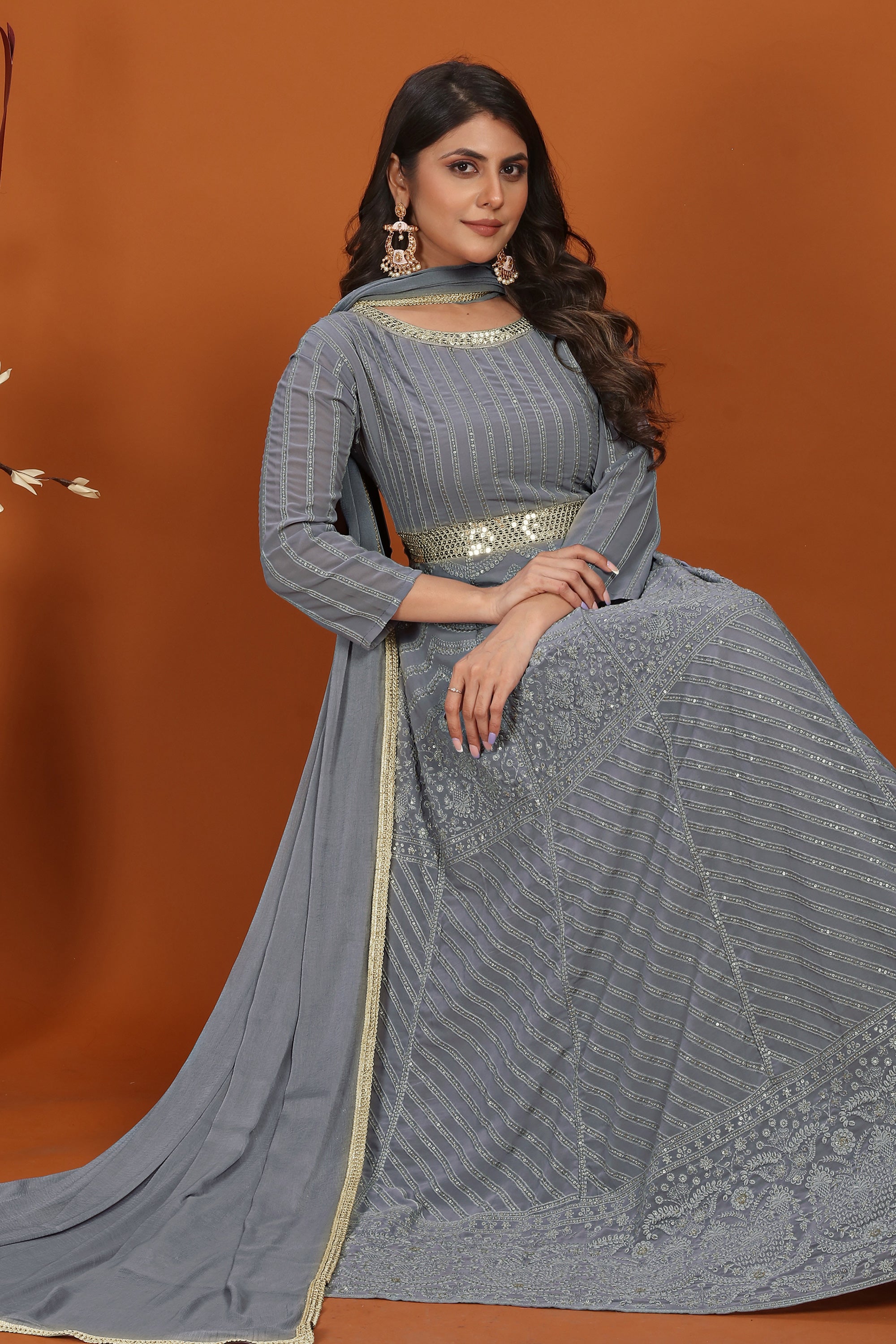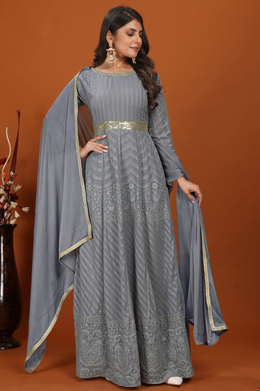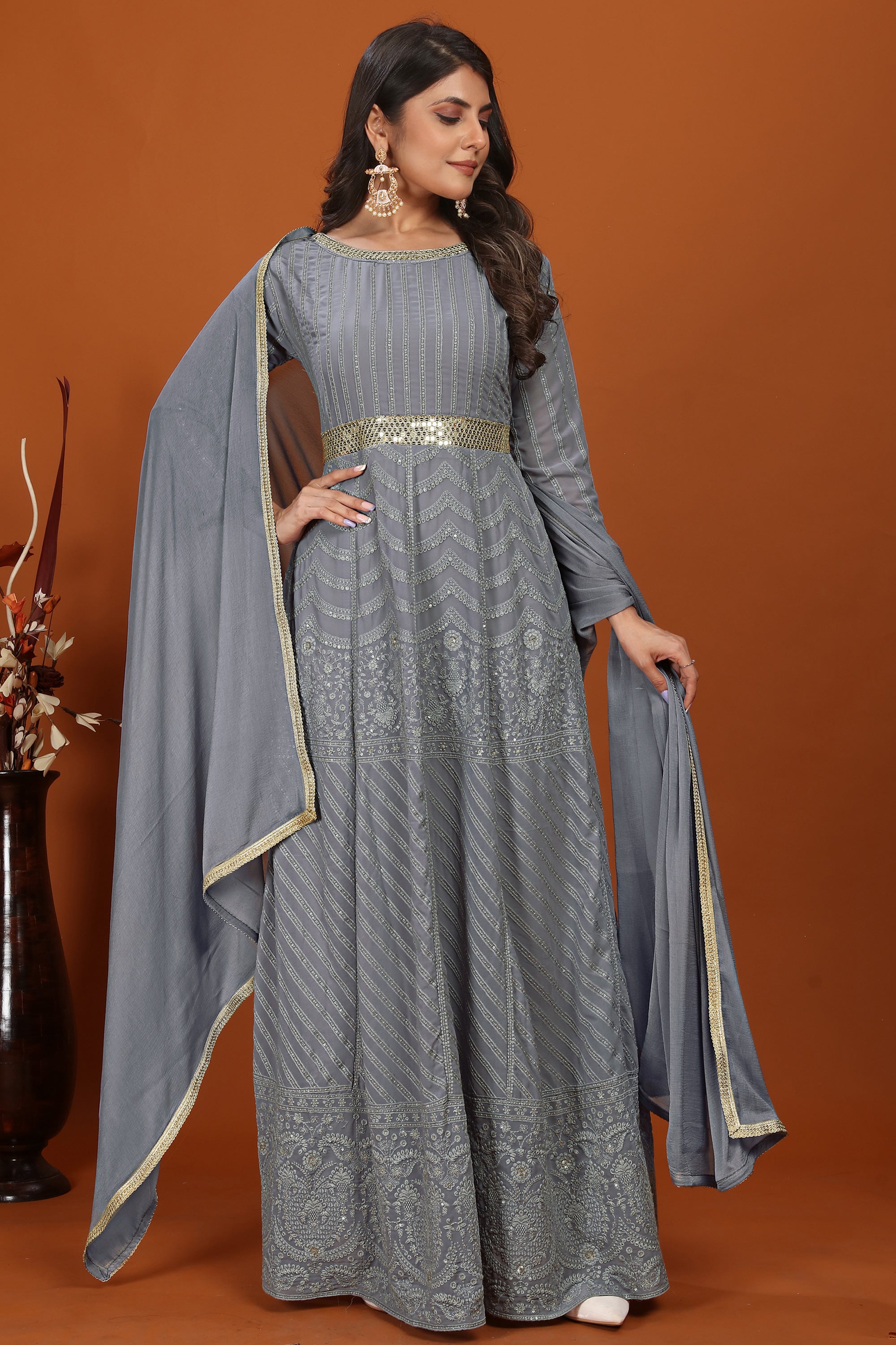 Georgette Fabric Embroidered Work Magnificent Gown With Dupatta In Grey Color
