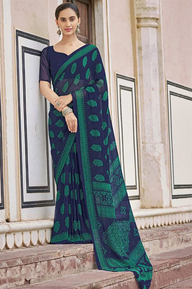 Georgette Fabric Fashionable Printed Saree In Navy Blue Color