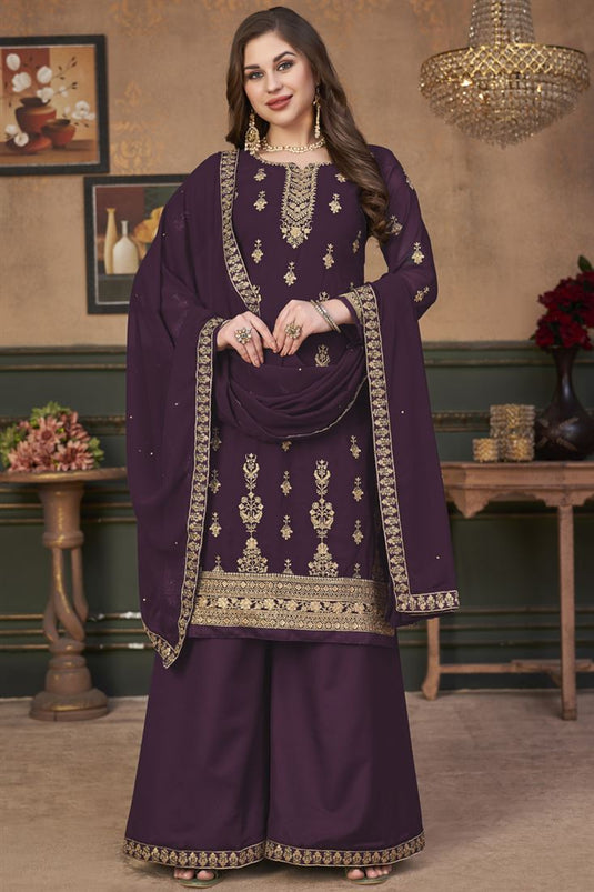 Georgette Fabric Festive Wear Embroidered Glamorous Palazzo Suit In Purple Color