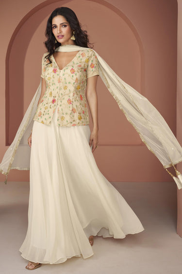 Georgette Fabric Off White Color Embroidered Readymade Designer Indo Western Palazzo Suit