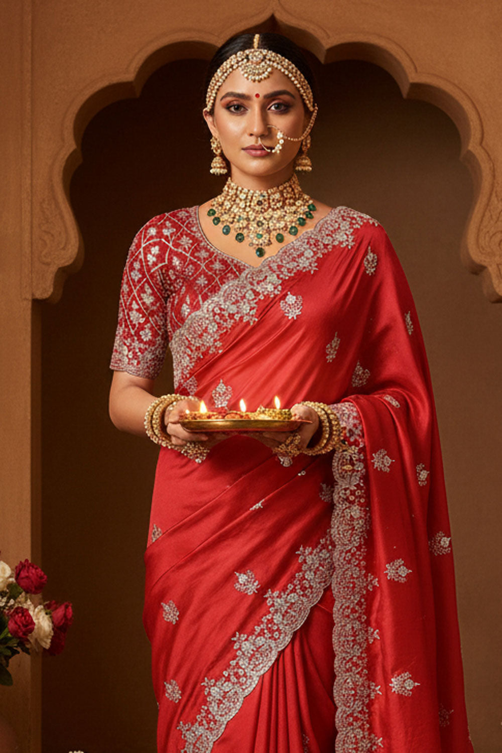 Celebrate the auspicious occasion of Karwa Chauth in style with this exquisite Georgette Satin Silk saree, designed to make every festive moment memorable. Featuring intricate Aari Embroidery, Dual Stone Embellishment, this saree exudes elegance and charm, perfectly suited for traditional celebrations. Its vibrant hues and delicate detailing make it a standout choice for festival gatherings, ensuring you shine with grace and sophistication. Please note, due to digital photography, slight color variations may occur, adding a unique touch to each piece. Embrace the festive spirit with this stunning Karwa Chauth saree and make every moment unforgettable.