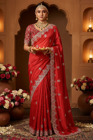 Georgette Fabric Red Color Riveting Saree With Fancy Work