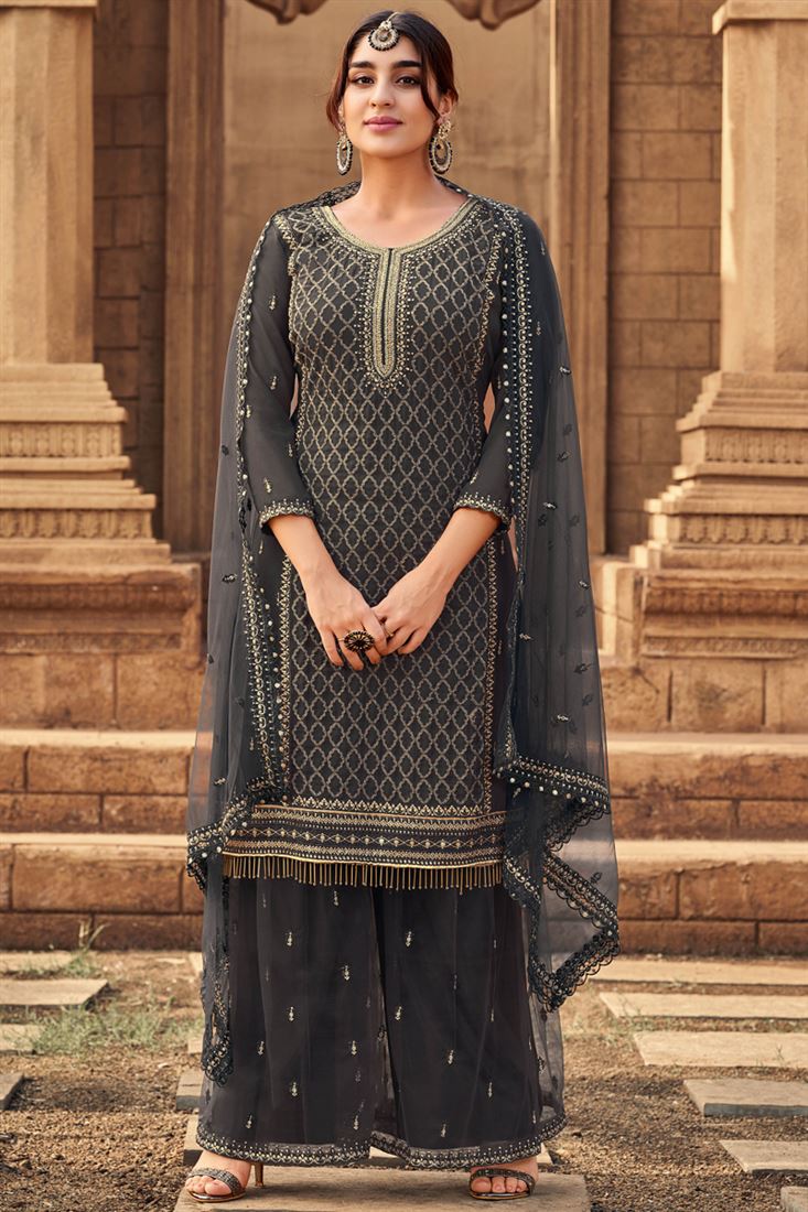 Georgette Fabric Sangeet Wear Grey Color Palazzo Suit In Embroidered Work