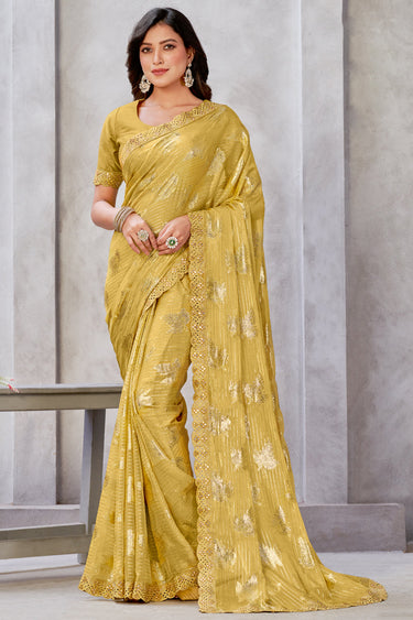 Georgette Fabric Weaving Work Mustard Color Sangeet Wear Trendy Saree