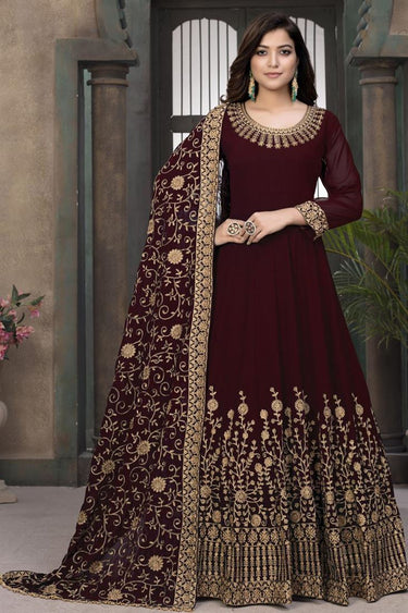 Georgette Fabric Wedding Wear Fancy Embroidered Anarkali Salwar Suit In Maroon Color