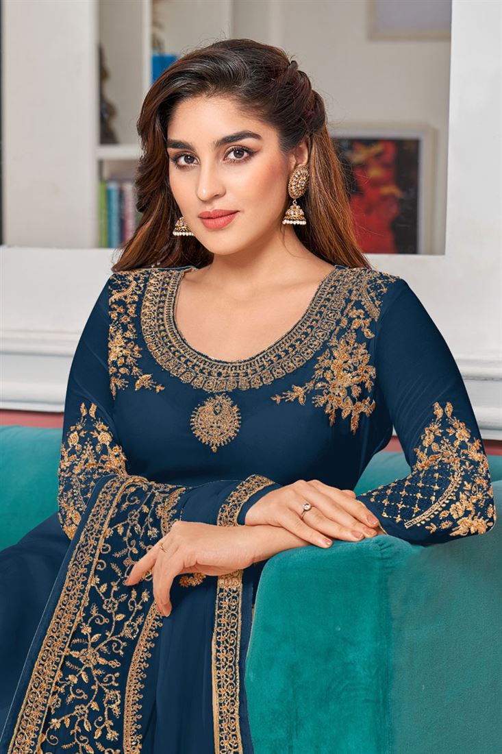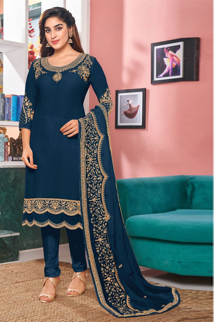 Georgette Fabric Wonderful Embroidered Salwar Suit In Teal Color