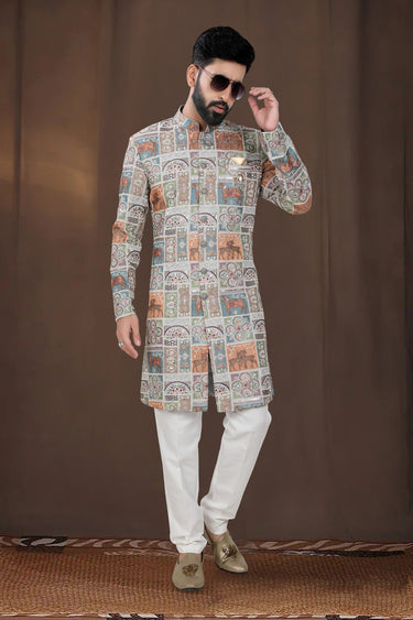 Experience luxury with this Readymade Indo Western ensemble designed specifically for men attending weddings. Made from premium fancy fabric, this outfit guarantees a comfortable and stylish experience. The innovative Indo Western design captures the best of both worlds, blending traditional elegance with modern trends. Ideal for the discerning man who wants to make a lasting impression, this outfit comes in an array of striking colors. Whether you're the groom, a groomsman, or a guest, you'll appreciate the ease and sophistication this ready-to-wear garment offers. Add a touch of class to your wedding attire with this stunning Indo Western outfit.