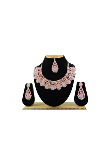 Glamorous Pink Color Alloy Material Necklace with Earrings and Mang Tikka