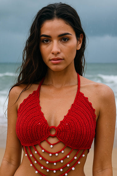 Step into boho elegance with this 100% Cotton Yarn Soft Durable And Lightweight Crochet Bikini Top. Handcrafted for a one-of-a-kind design, its deep, bold color adds sophistication to any look. Featuring adjustable straps, it ensures a perfect fit tailored to your comfort. The breathable cotton fabric keeps you cool and comfy whether you're lounging at the beach or enjoying a lively festival. Fade-resistant and easy to maintain with gentle handwashing, this bikini top stays vibrant wear after wear. Pair it with your favorite cover-up or wear it as a standout piece to express your unique style.