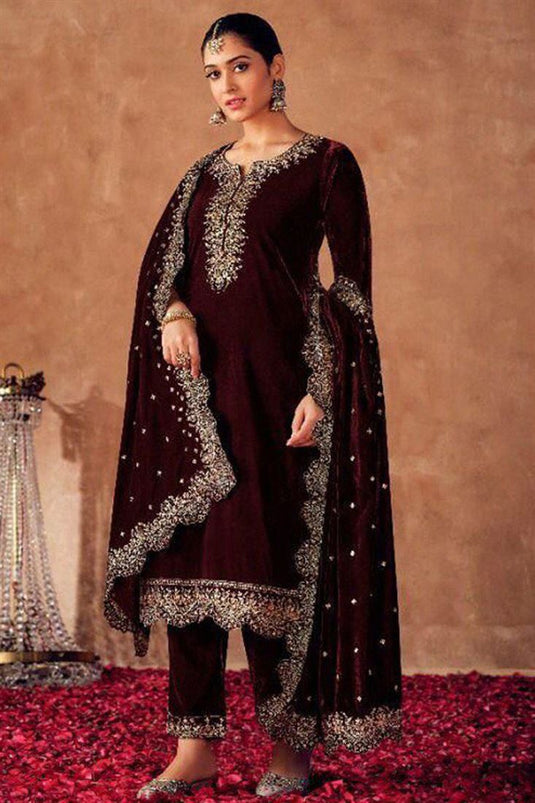 Glittering Maroon Salwar Suit In Velvet Fabric