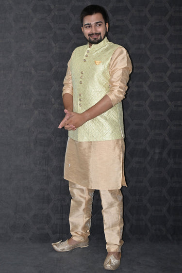 Step out in style in our beautifully tailored golden colored Kurta Pyjama, a classic piece from our collection. Designed to dazzle, this exquisite readymade ensemble is crafted from luxurious Art Silk Fabric. Complete with a 3 piece jacket set, this attire ensures you'll always be at the center of attention. A stunning choice for any reception or formal event.