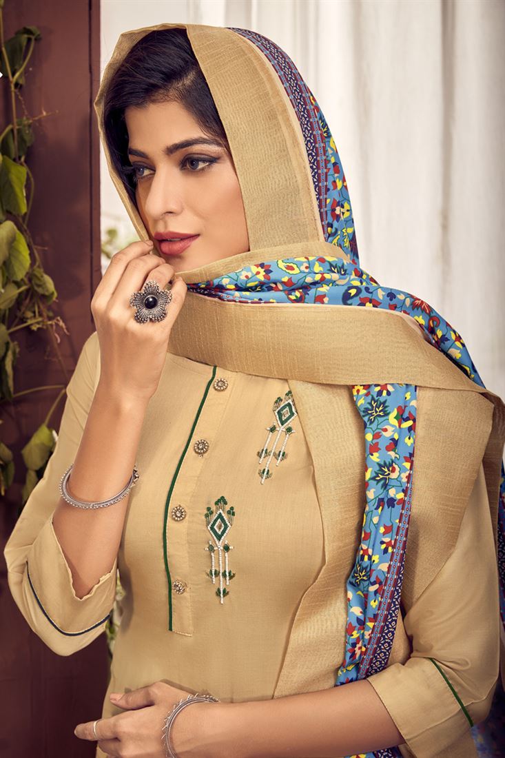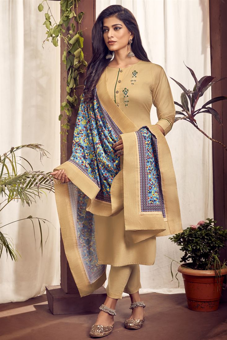 Gorgeous Beige Cotton Fabric Festive Wear Readymade Straight Cut Salwar Suit With Printed Dupatta