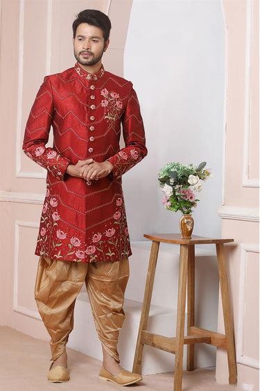Gorgeous Maroon Color Banarasi Silk Fabric Wedding Wear Groom Sherwani For Men