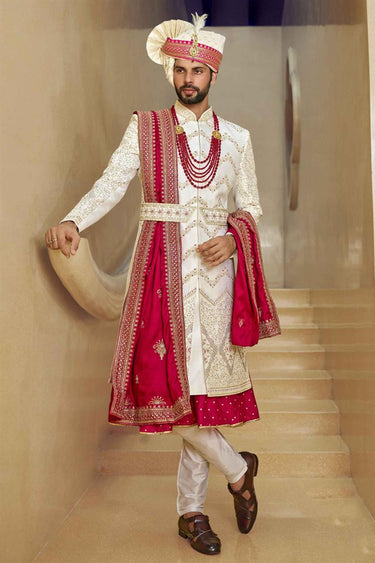 Gorgeous Off White Color Fancy Fabric Heavy Embroidered Designer Indowestern Groom Sherwani