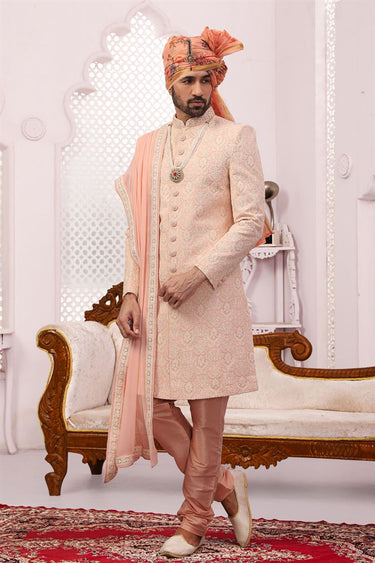 Gorgeous Peach Color Georgette Fabric Designer Groom Sherwani For Men