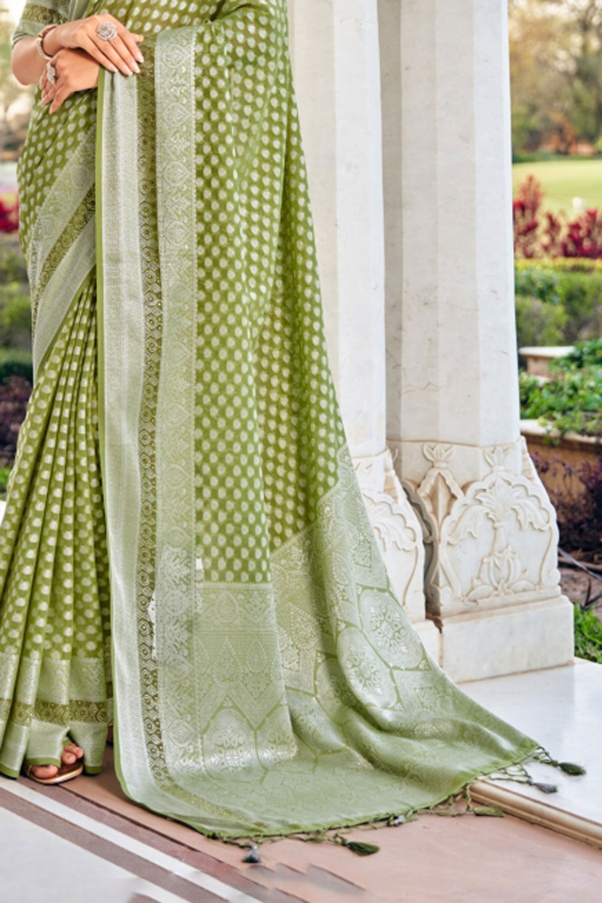Drape yourself in timeless elegance with this stunning Traditional Georgette Saree, a perfect blend of grace and tradition. Crafted from premium georgette fabric, it offers a soft, flowing drape that enhances your silhouette beautifully. The saree features intricate weaving buta work along the border and pallu, adding a rich and festive touch to your look. Paired with a matching georgette blouse fabric, it allows you to style it effortlessly for any traditional occasion. Ideal for festivals and celebrations, this saree is designed to make you shine with subtle sophistication. Please note, due to digital photography, slight color variations may occur.