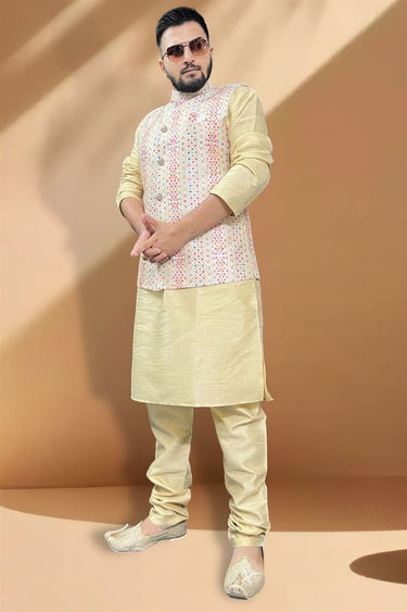 Graceful Silk Fabric Function Wear Cream Kurta Pyjama With Cream Color Jacket