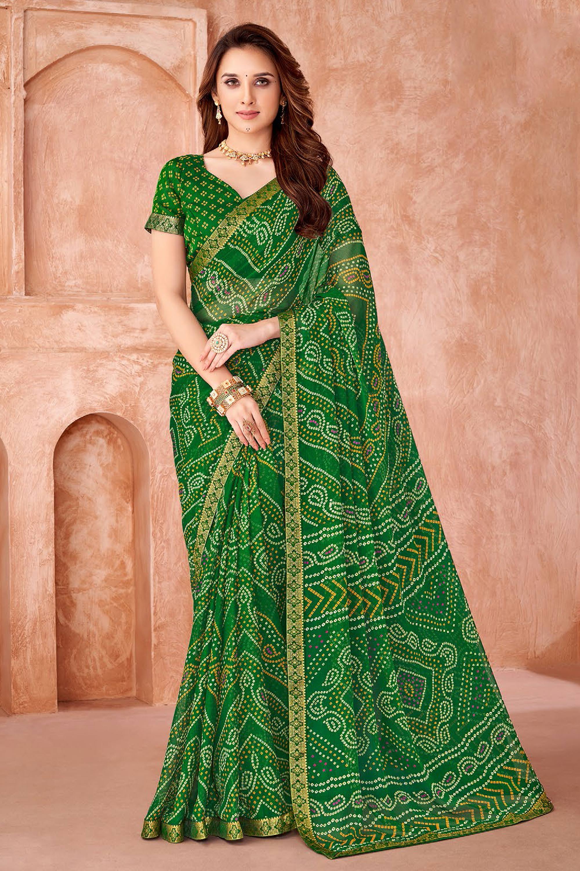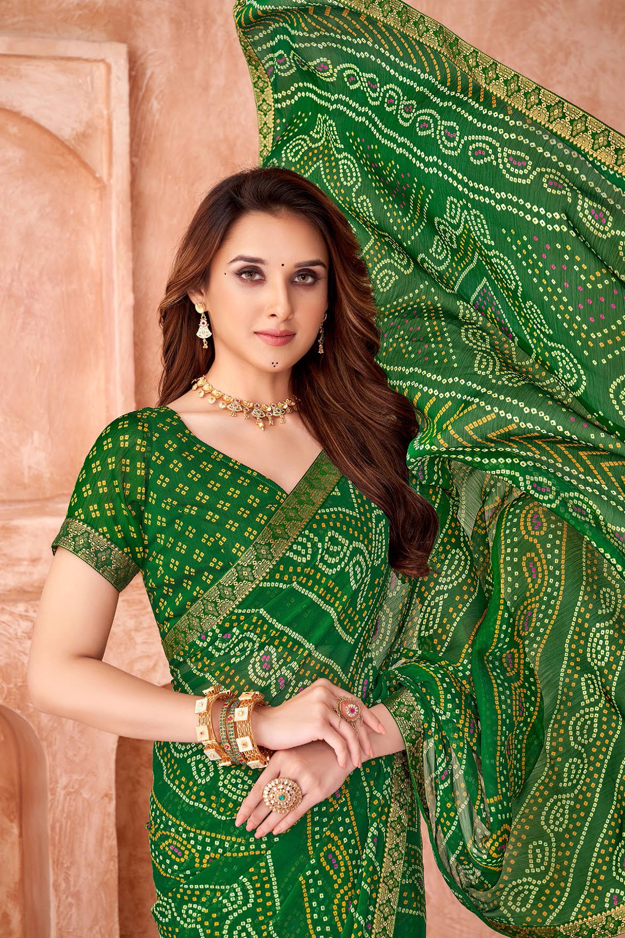 Green Bandhej Print Chiffon Daily Wear Saree With Blouse