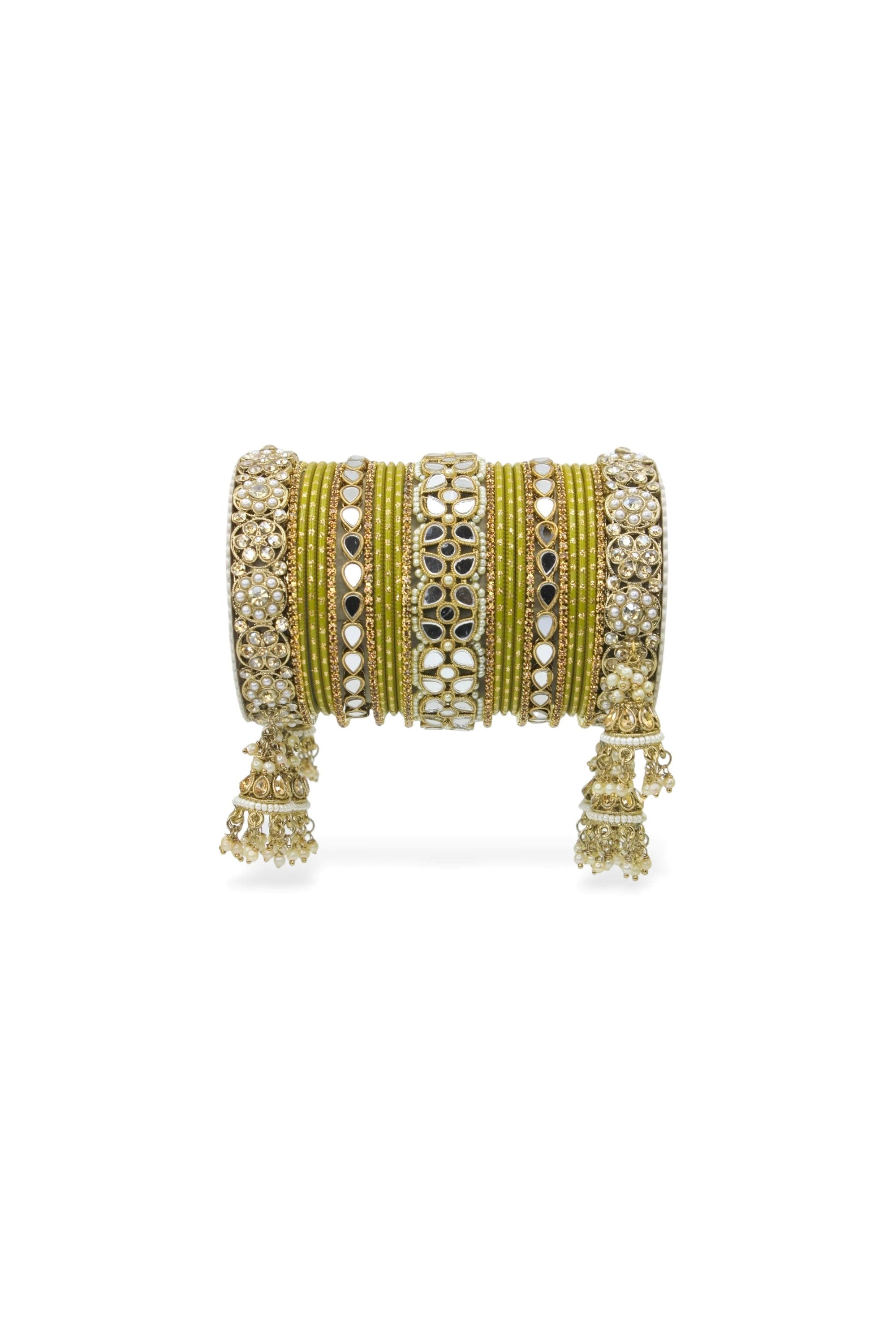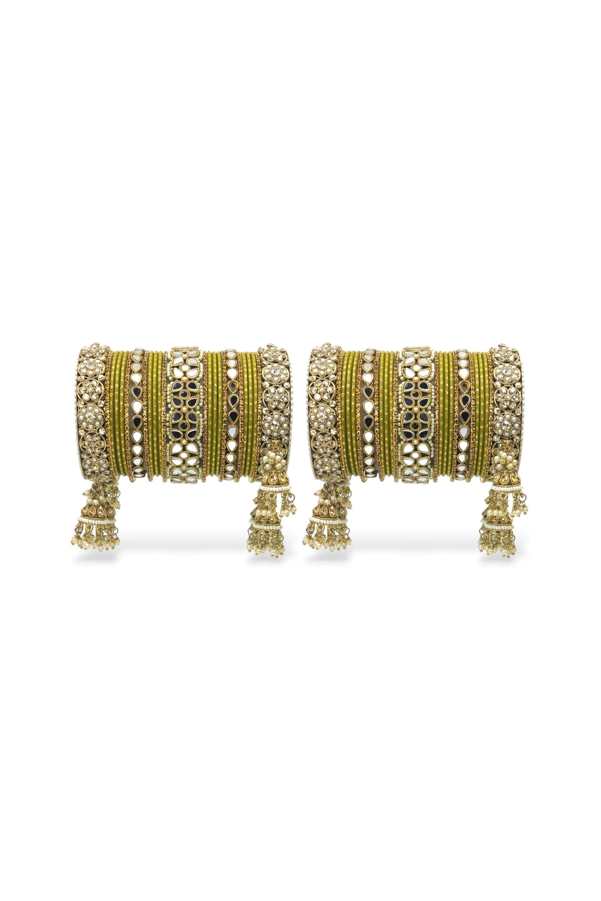 Green Color Alloy Material Mirror And Stone Work Wedding Wear Jhumka Bangle Set