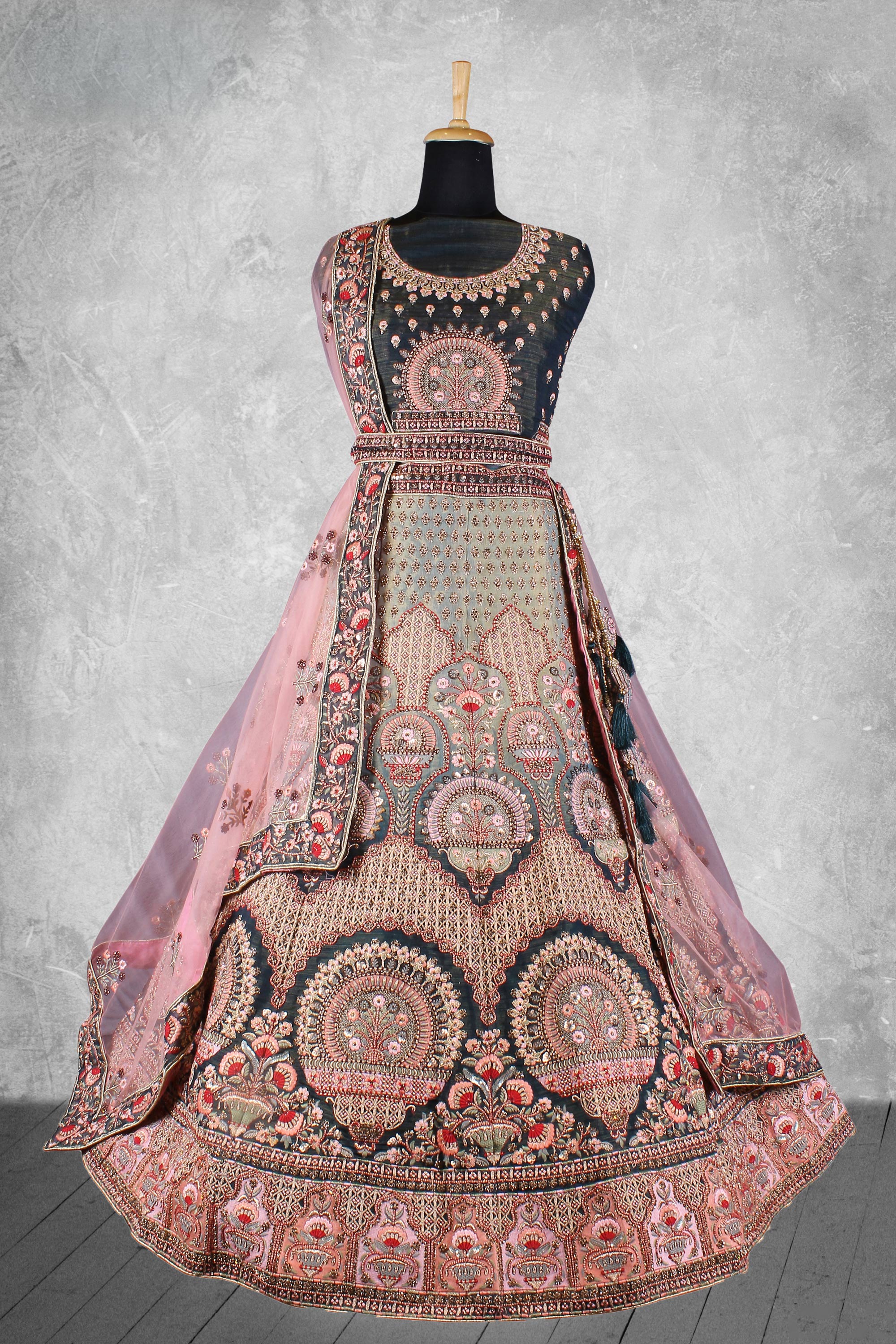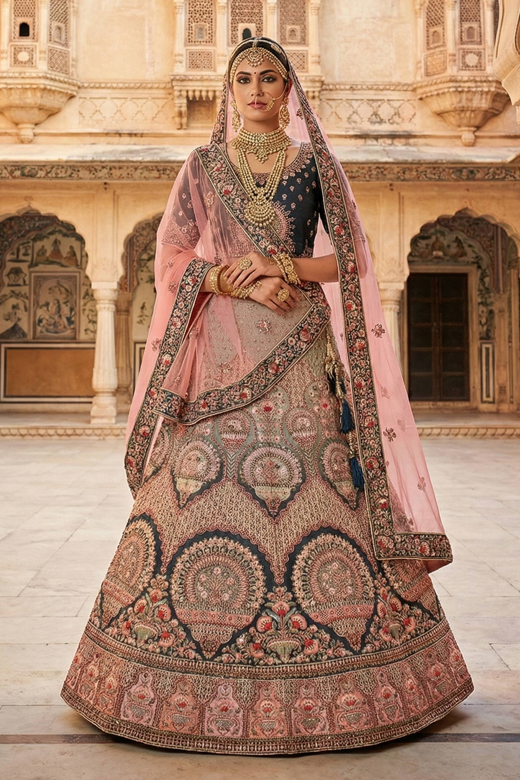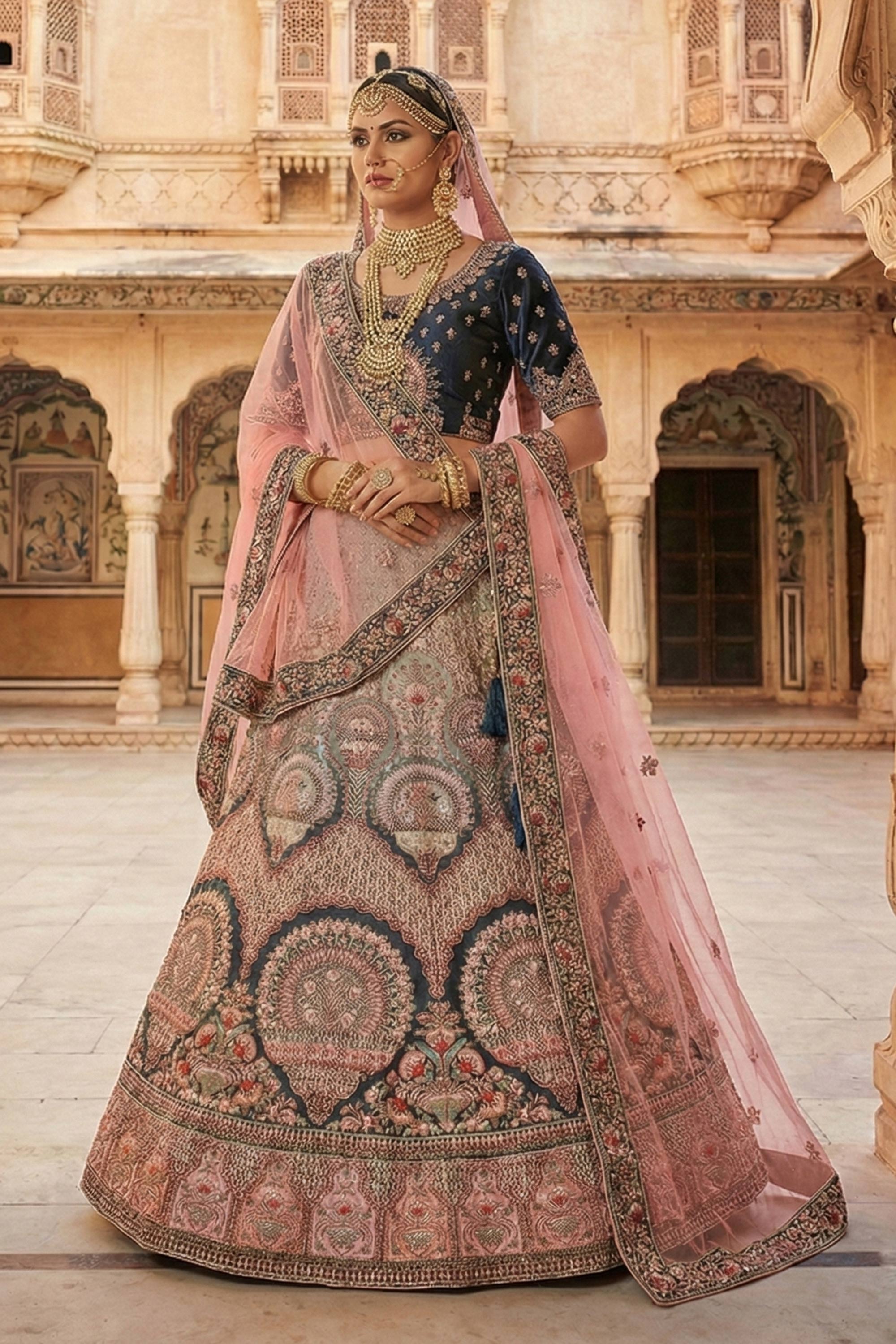 Add a touch of regal elegance to your wedding look with this stunning Bridal Lehenga. Crafted from premium velvet fabric, the lehenga is beautifully highlighted with intricate embroidery work, giving it a rich and luxurious finish. Note: Due to digital photography, slight color variations may occur.