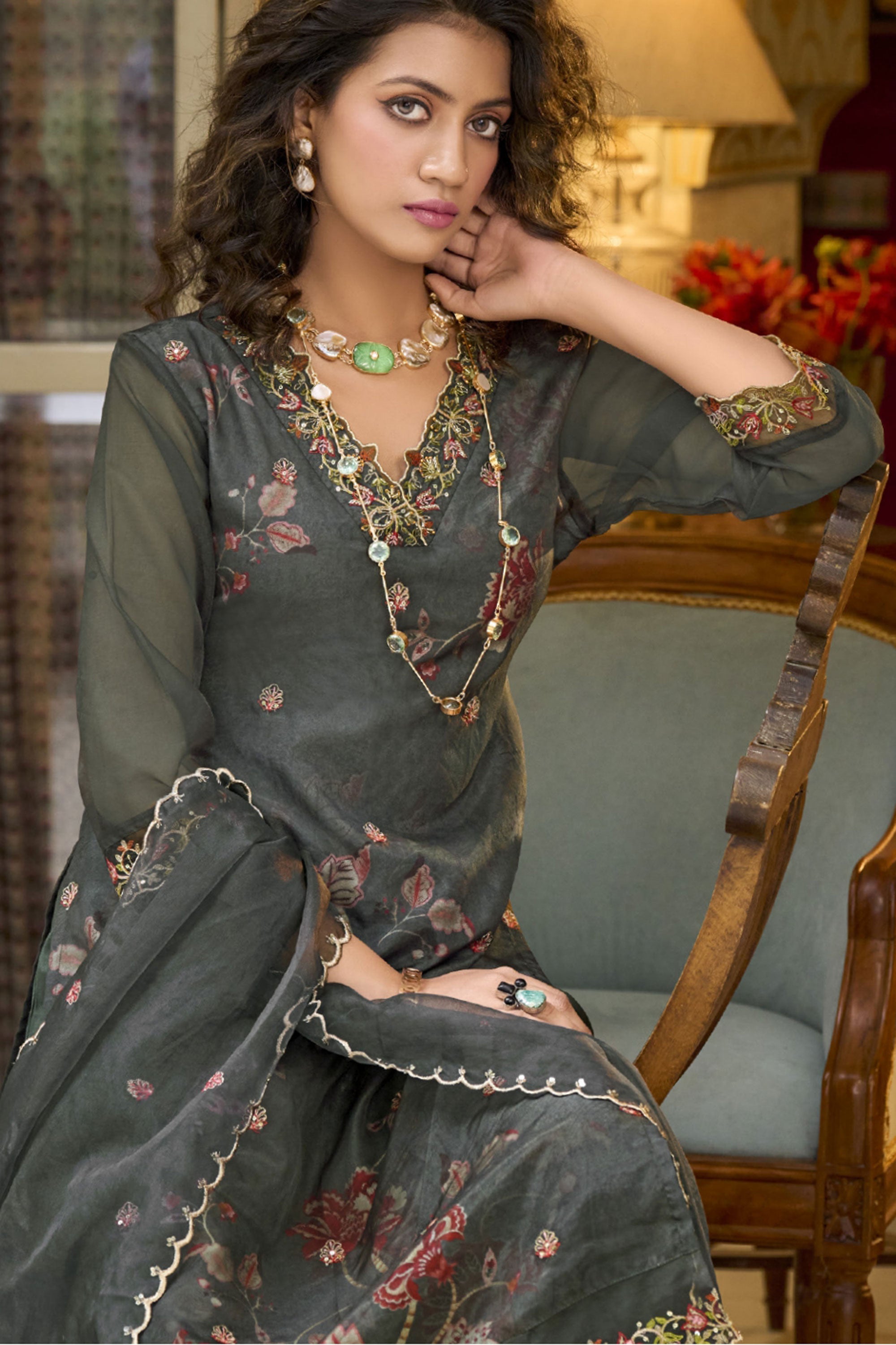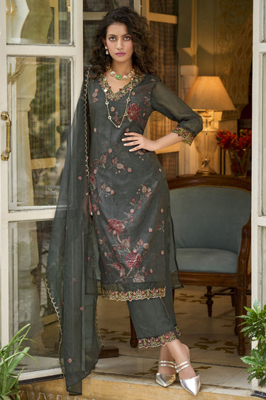 Grey Color Embroidered Readymade Straight Cut Suit In Organza Fabric