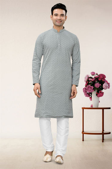 Grey Color Georgette Fabric Lucknowi Work Readymade Lovely Kurta For Men