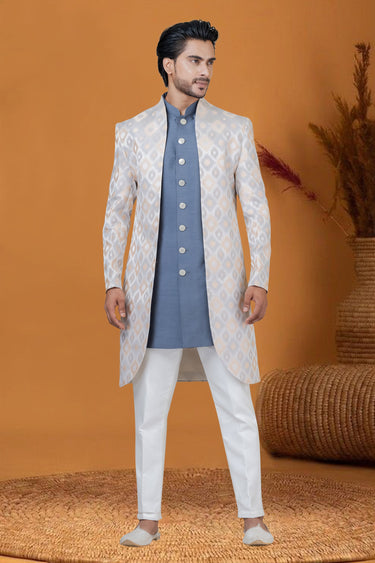 Grey Color Sangeet Wear Jacquard Silk Fabric Jacquard Work Designer Readymade Indo Western For Men