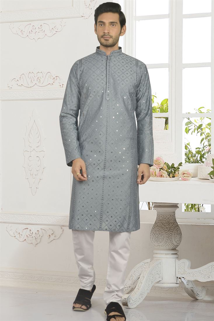Grey Color Silk Fabric Festive Wear Embroidered Readymade Kurta For Men