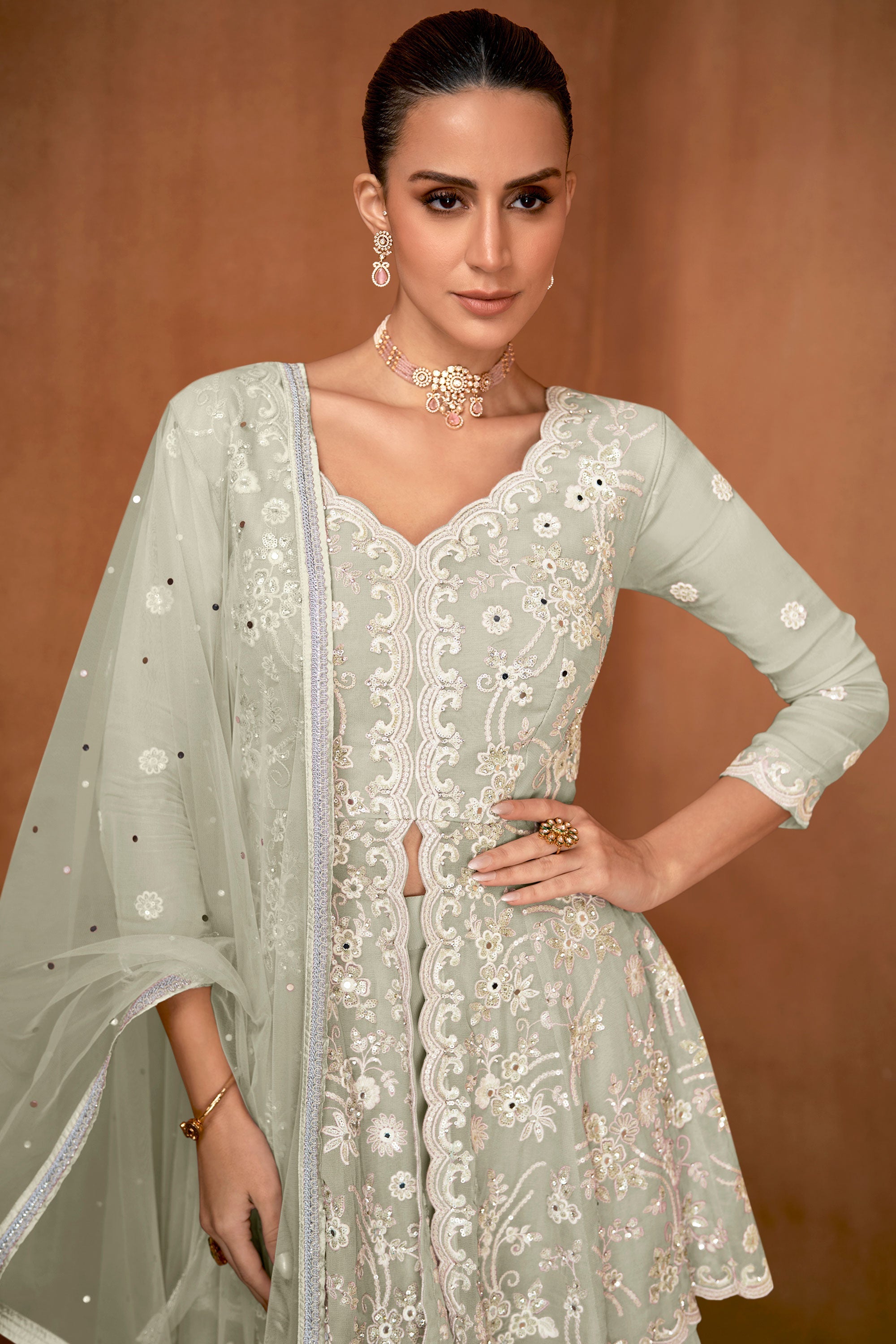 Enhance your ethnic style with the Lovely Embroidery Work Readymade Sharara Style Salwar Kameez. The delicate embroidery on this beautiful outfit showcases a graceful combination of tradition and trend. Designed for convenience, the pre-stitched ensemble makes dressing up quick and easy while offering a polished and stylish look. The breathable fabric and flowing Sharara bottom ensure you stay comfortable and chic during any celebration. Ideal for family events, weddings, or festivals, this timeless outfit stands out for its exquisite detailing and vibrant design. Step into the spotlight with an outfit that’s both fashionable and effortless!