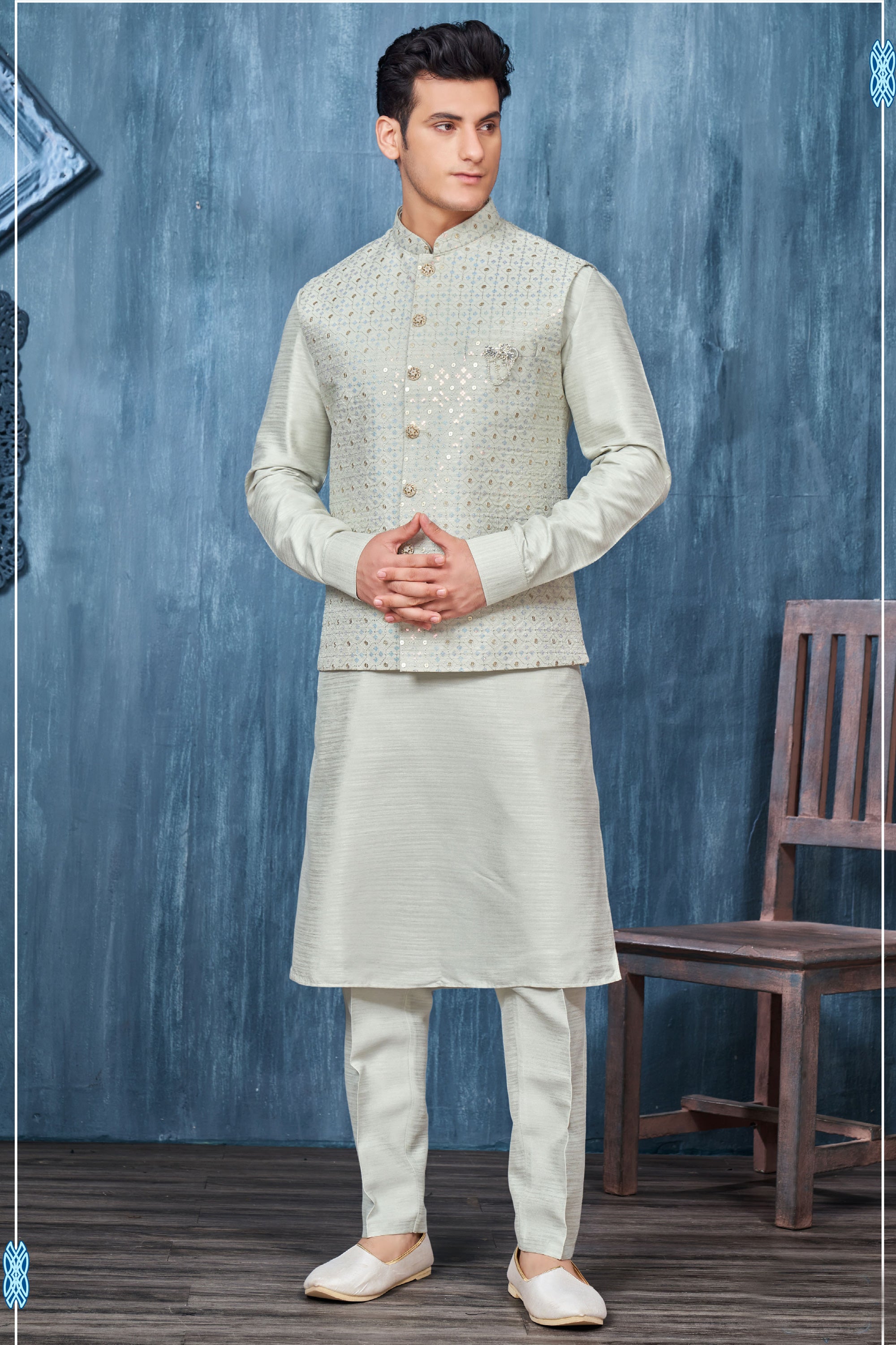 Immerse yourself in cultural elegance with our Reception Wear Beautiful Color Attractive Embroidery Work Readymade Kurta Pyjama For Men With Jacket. It is perfect for special occasions, radiating sophistication and grace. The Faux Satin lining provides extra comfort, whilst the Art Banarasi Silk bottom adds an exquisite touch. Comes in a unique Aligadhi Pant style. Available in sizes 34,36,38,40,42,44. Estimated delivery is 15-18 working days.