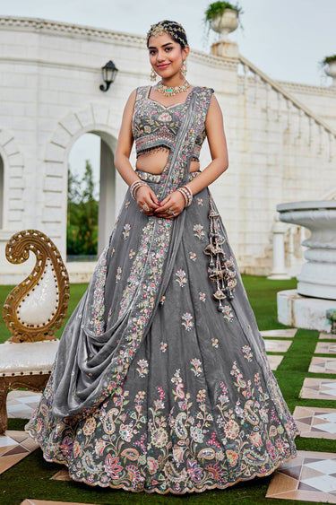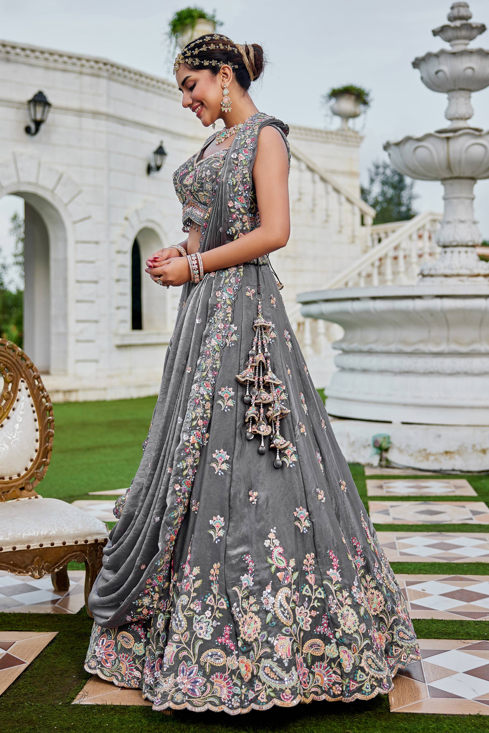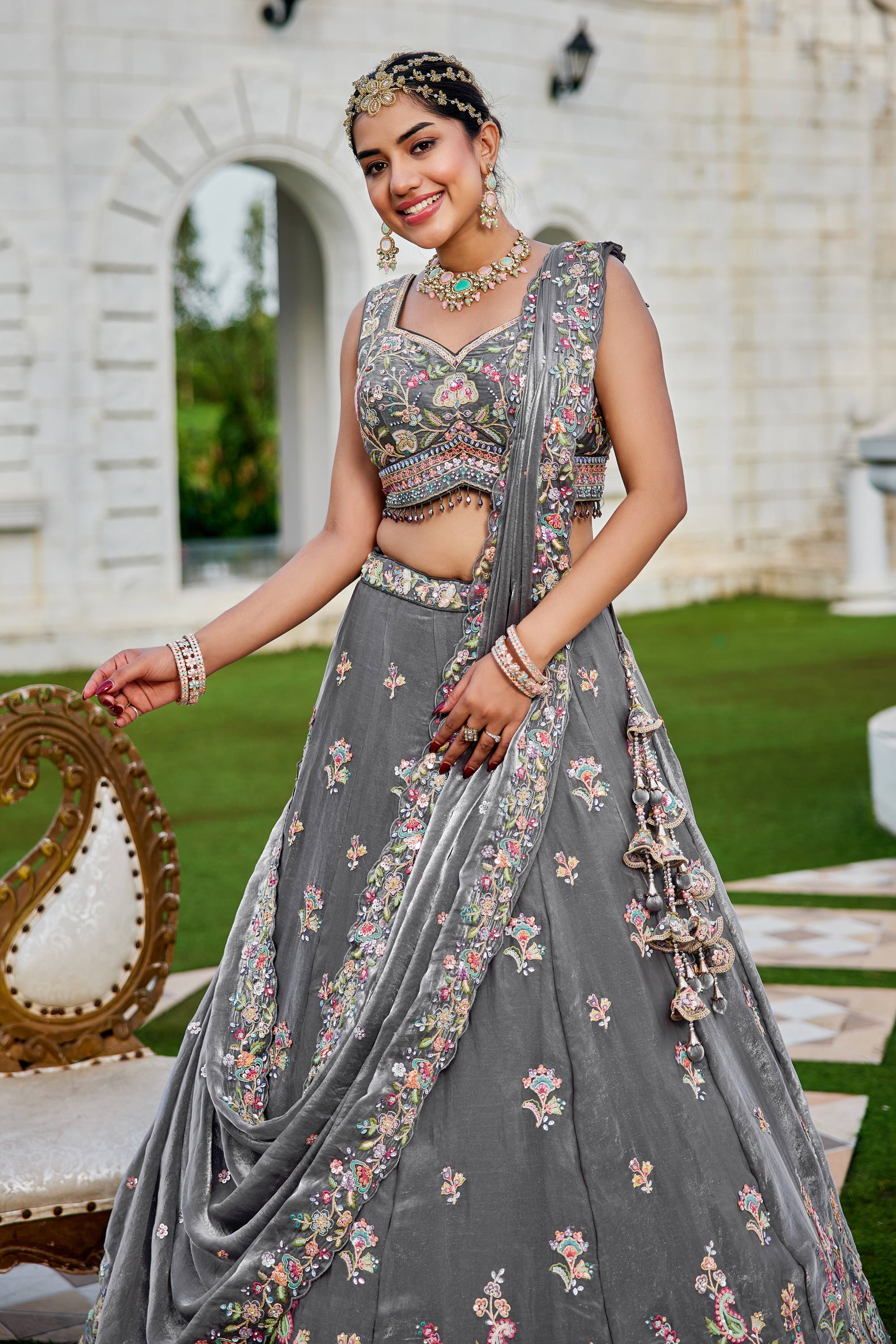 Grey Wedding Wear Tissue Embroidered Lehenga Choli With Dupatta