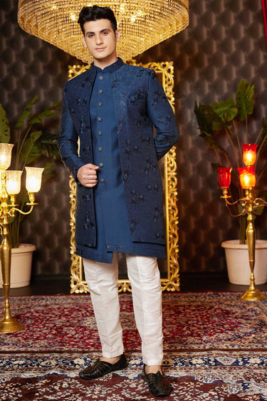Heavy Embroidered Blue Color Art Silk Fabric 3 Piece Indo Western For Men