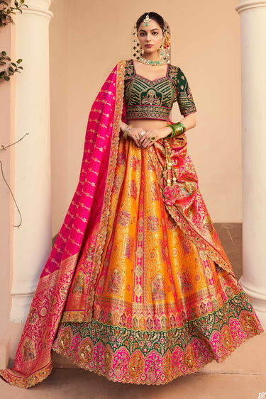 Heavy Embroidered Orange Bridal Lehenga Choli In Banarasi Silk Fabric