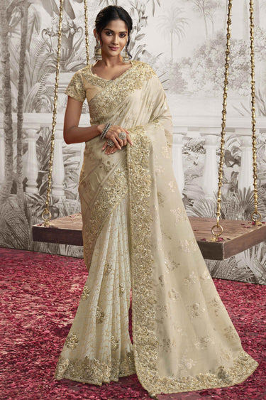 Heavy Embroidery Work Winsome Beige Color Fancy Fabric Saree With Party Look Blouse