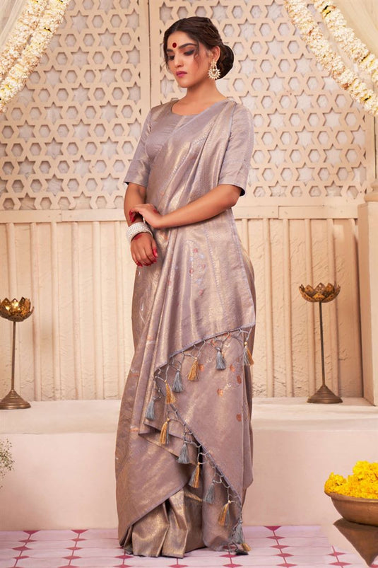 Imperial Grey Color Kanjivaram Silk Fabric Function Wear Saree