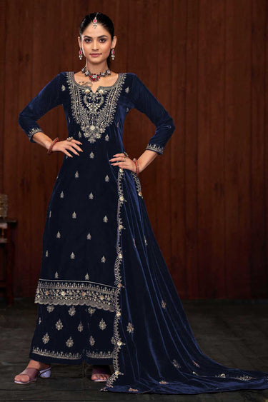 Incredible Navy Blue Color Function Wear Velvet Palazzo Suit