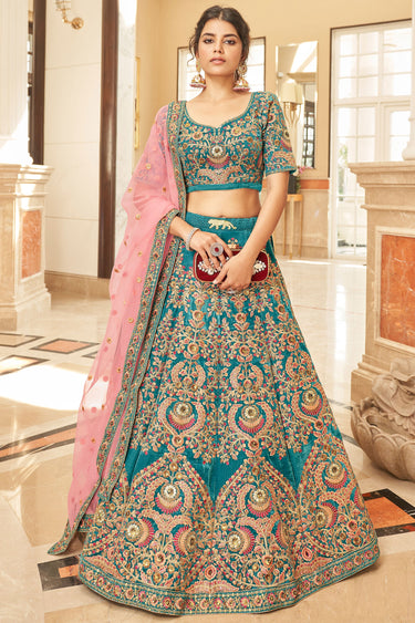 Ingenious Embroidered Teal Color Velvet Fabric Wedding Wear Lehenga