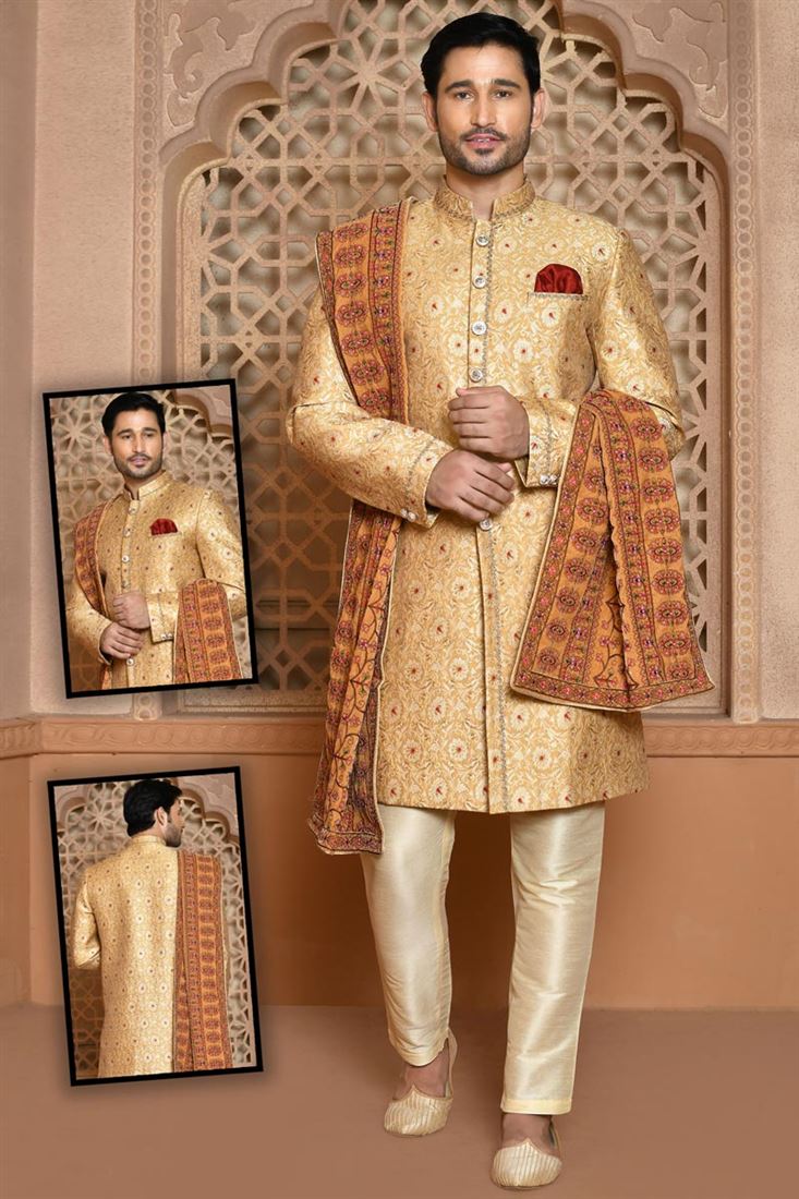Intriguing Golden Color Wedding Wear Banarasi Silk Sherwani