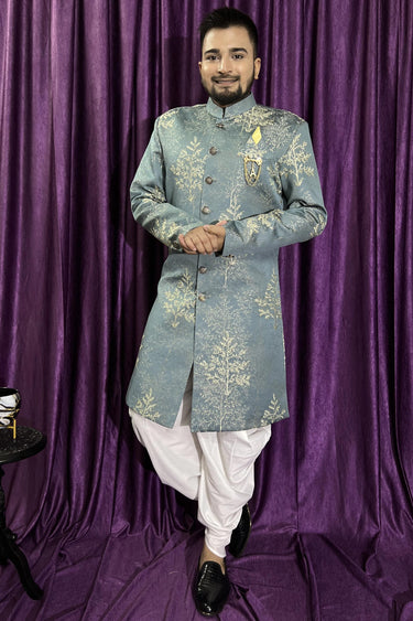 Elevate your style quotient with this Reach Color Wedding Wear Designer Readymade Peshawari Style Indo Western For Men. It comes with a stunningly beautiful kurta and breeches that add a touch of tradition to the contemporary style. The intricate work and exquisite embroidery on the collar, cuffs, and front make it an ideal outfit for special occasions. The high-quality material used in making this outfit makes it comfortable to wear for long hours without any irritation. The contemporary look makes it versatile and can be paired with a variety of footwear and accessories. Make a statement at weddings and formal events with this classic yet trendy Indo Western outfit.