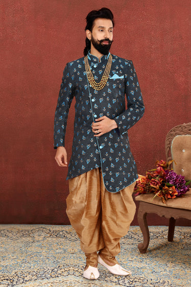 Jacquard Silk Blue Wedding Wear Attractive Readymade Men Indo Western