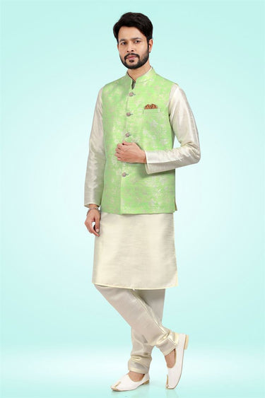 Jacquard Silk Fabric White Color Festive Wear Readymade Men Stylish Kurta Pyjama With Nehru Jacket set