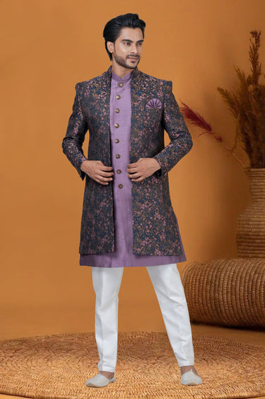 Jacquard Work Appealing Multi Color Jacquard Silk Fabric Wedding Wear Readymade Indo Western For Men